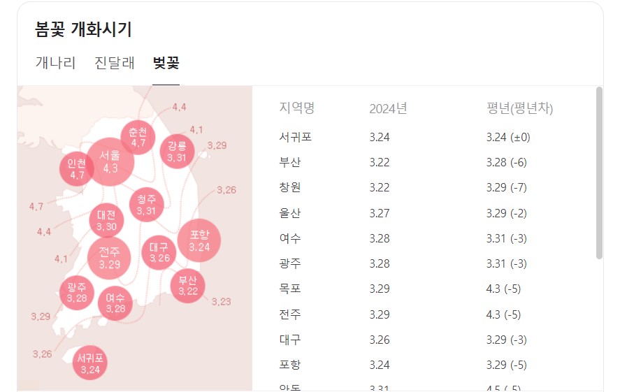 이제 꽃피는 3월입니다. 해마다 귓가에 맴도는 노래 가사처럼 봄바람 휘날리며 벚꽃 흩날리는 길을 걸을 때가 가까워집니다. 올해에는 언제쯤 꽃이 개화해서 꽃길을 걷게 될지 알아보겠습니다. 미리 미리 확인하시고 드라이브 코스, 여행코스에 참고하세요.