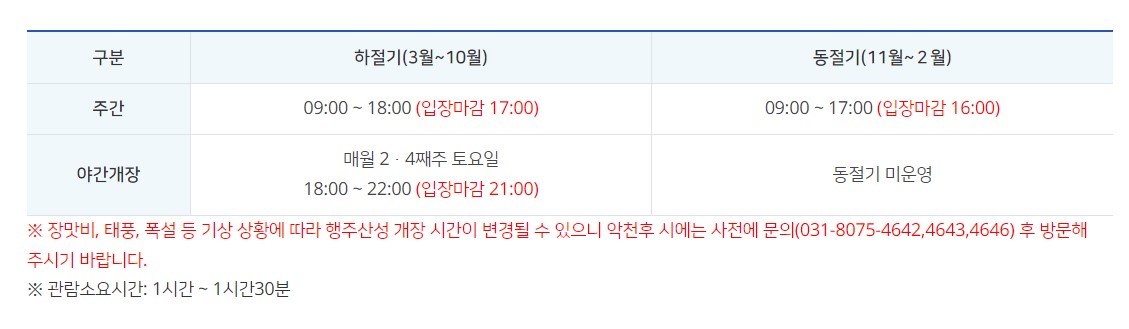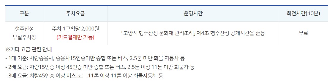 - 주차장 : 행주산성 제1주차장(80면), 제2주차장(150면)