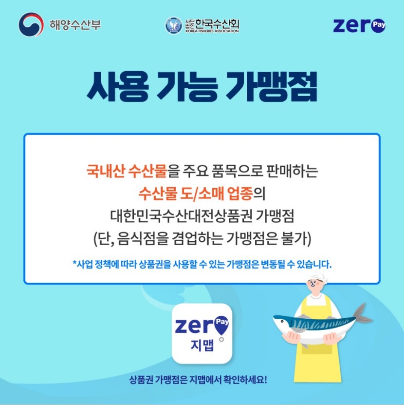 지난달에 이어 이번달에도 대한민국 수산대전이 열립니다. 4월 '수산인의 날' 제로페이 상품권 구매 안내드립니다. 물가안정과 가정의 건강을 위해 수산식품을 조금 더 저렴하게 구입할 수 있도록 할인하는 '2024 대한민국 수산대전'이 4월 4일부터 4월 21일까지 운영됩니다.