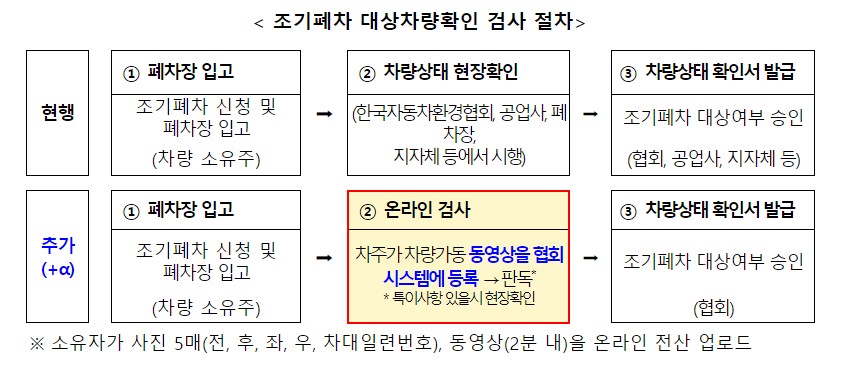 2. 조기폐차 지원금 지급 대상 차량의 검증 검사를 위한 온라인 검사 방식이 새롭게 도입됩니다. 조기폐차를 신청하는 차주가 온라인 시스템에 자신의 차량 이미지를 등록하면 한국자동차환경협회가 조기폐차 대상 여부를 확인해주는 방식입니다. 이렇게 되면 기존 현장 검사를 확인하기가 쉽지 않았던 도서지역 등도 쉽게 검사할 수 있게 됩니다.