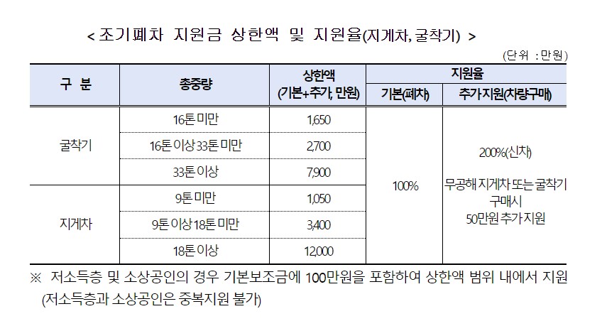 조기폐차 지원금 상한액 및 지원율 (지게차, 굴삭기)