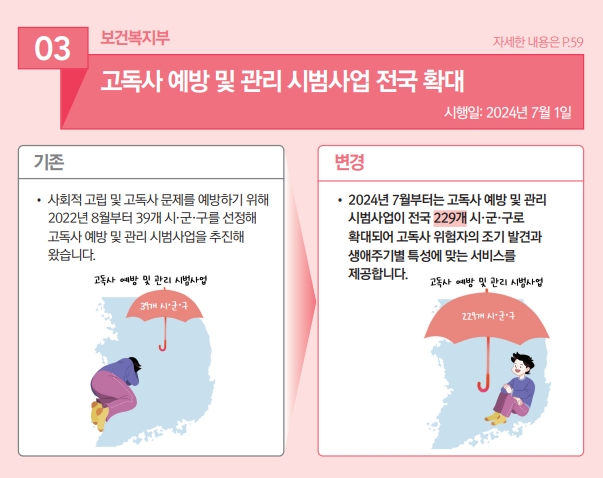 1인 가구 증가와 사회관계망 약화 등으로 증가하는 사회적 고립 및 고독사 문제를 예방하기 위하여 39개 시,군,구에서 추진 중인 고독사 예방 및 관리 시범사업이 7월부터 299개 시,군,구로 전국에서 시행됩니다. 지역별 특성에 맞는 생애주기별 고독사 예방사업이 이루어지는 만큼 자세한 사항은 주소지 관할 시,군,구로 문의하시기 바랍니다.